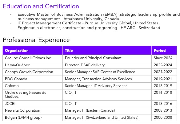 In the United States, Alexandre Bertolo worked with prestigious corporations like Bulgari (part of the LVMH group, the world leader in high-quality products), where he played a key role in the verticalization of the perfume branch using SAP. In Canada, he led the merger of Newalta Corporation’s acquisitions by standardizing SAP usage across Eastern Canada. More recently, he successfully completed the IT delivery for the digital transformation of Héma-Québec, an SAP program exceeding $40 million, utilizing SAP S/4HANA RISE in a GxP environment. Additionally, he implemented and operated an ERP Center of Excellence solution in a cloud environment for Canopy Growth Corporation.